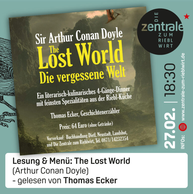Nach vier restlos ausverkauften literarisch-kulinarischen Abenden – von Jules Verne bis Edgar Wallace – steht das nächste 4-Gänge-Lesedinner bereit. Dieses Mal geht es hoch hinaus: Professor George Edward Challenger bricht zu einer Expedition in den Amazonas auf, fest entschlossen, seine kühne These zu beweisen – dass auf einem abgelegenen Plateau eine urzeitliche Welt überlebt hat, […]